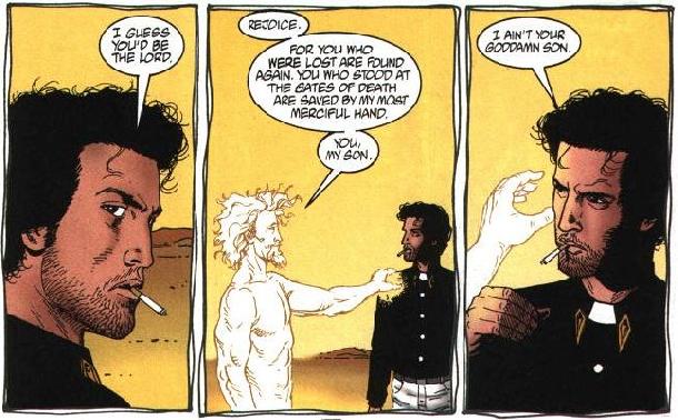 Sul rapporto con il padre di Jesse, cioè un predicatore, si tornerà sicuramente la prossima stagione, ma già finora è evidente che il figlio ha cercato di confrontarsi con lui seguendone le orme, prendendo le sue vesti e cercando di guidare la sua Chiesa. Riguardo il padre di Genesis la questione è più complessa, perché l'entità è il frutto “impossibile” dell'unione carnale tra un angelo e un demone, ma più concretamente è come se fosse il figlio rinnegato di Dio, rinchiuso in una prigione celeste perché non possa sviluppare il suo potere e ora sceso in Terra approfittando “dell'assenza di Dio”. Avendo perso suo padre, Jesse chiude la prima stagione di Preacher con l'intento di trovare nientemeno che il Padre Eterno, per capire se ha bisogno di aiuto o di essere preso a calci in culo. Insomma la mancata emancipazione dalla figura paterna terrena è destinata a essere traslata nel confronto con quella ultraterrena per eccellenza.
