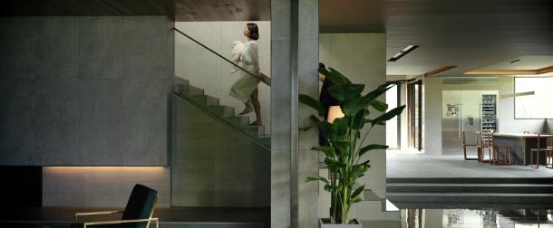 Sale le scale con il suo barboncino bianco in braccio, cammina altera nel corridoio rivestito di boiserie di mogano, tutta giocata sull'elegantissimo contrasto tra il legno scuro e il cristallo, l'opulenza si manifesta con discrezione. L'ambizione artistica invece no.